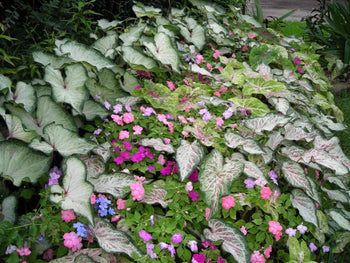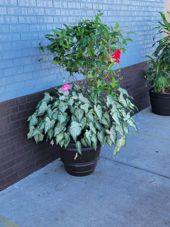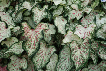 Candyland caladiums feauture pink spots with white main veins and a green margin. Candyland can tolerate full sun and will do well if placed in the landscape. This caladium shows out on its own but also when paired with other caladiums or flowering plants.