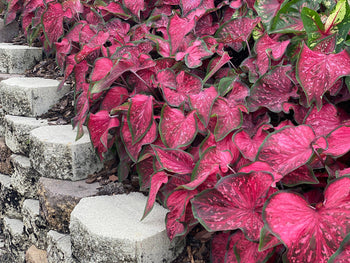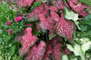 Scarlet Flame is a strap leaf caladium variety with a leaf pattern similar to the classic variety Lance Whorton. However, unlike Lance Whorton, Scarlet Flame is fast growing and has great full mounding plant habit. Scarlet Flame is super in small and larger pots and makes a very nice full hanging basket. In combination patio planters or landscape Scarlet Flame is useful as a border plant and will tolerate full sun.