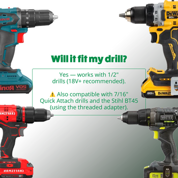 The gallon pot & post hole auger is one of our Heavy Duty drive augers that can fit various drills or powerheads. It will fit any 1/2-inch drill chuck – or larger drill chucks – with the use of the hex adapter included with this purchase. In addition, the post hole auger bit will fit a Stihl BT45 power unit with a threaded end when purchased with a threaded adapter (sold separately). Our adaptable tube drive augers feature 2 holes with pins for mounting and will fit auger powerheads with a 3/4-inch shaft. Additionally, our Quick Attach Auger Adapter is designed for seamless auger performance with any drill with a 7/16″ Quick Attach Chuck. This is a smart option for professional landscaping businesses that need to switch between drills and powerheads throughout the day.